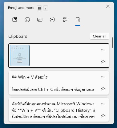 หลังจากนั้นทุกครั้งที่กด Win + V จะมีหน้าต่าง Clipboard แสดงขึ้นมา